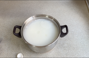 - Calentar el agua en una cazuela a fuego medio, no dejar que cueza, tiene que tener una temperatura constante para que el jabón no se queme.